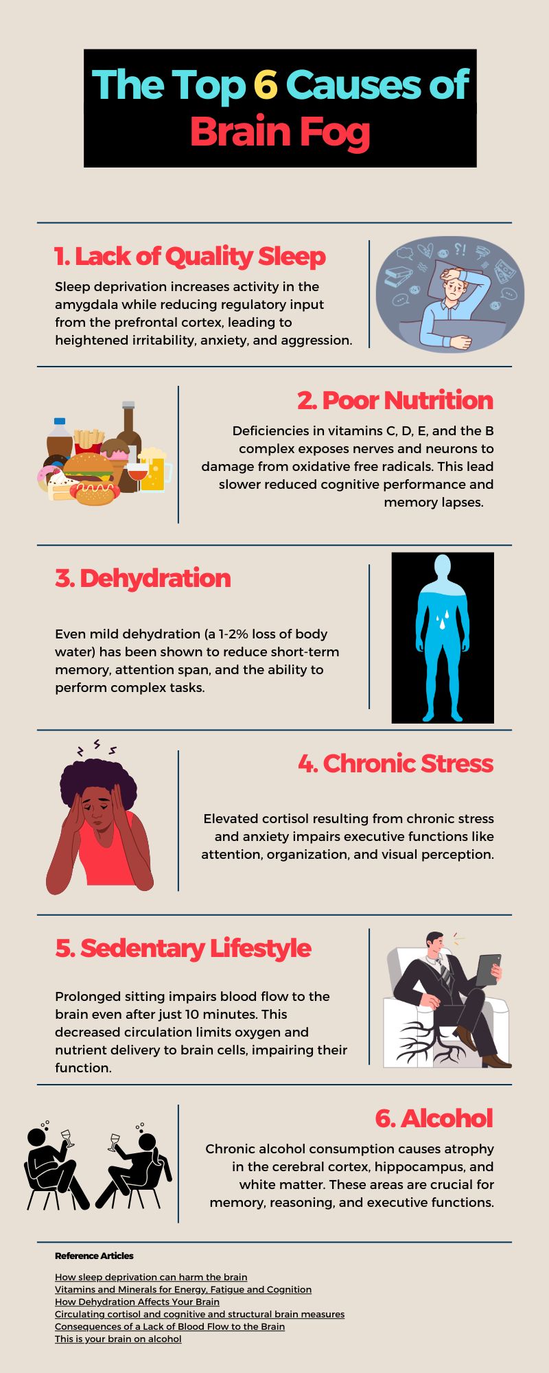 The following infographic highlights the six most common causes of brain fog.